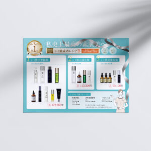 エステサロン店内使用化粧品POP 前提条件 デザインの説明 シミがなくなる透明感を出すため、見出し文字は白文字にしました。安心感を感じてもらえるよう、コスメのNo.1マークは大きく配置しました。商品部分は装飾を控えめにし