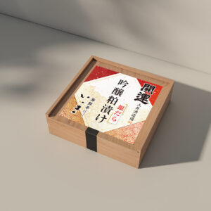 吟醸粕漬けの魚の切り身真空パックラベルデザイン 前提条件 デザインの説明 類似商品が並ぶ食品の棚であっても、しっかりと目にとめてもらえるよう華やかなカラーをメインに、プレゼントやお土産としてもご購入いただくことを考え、懸
