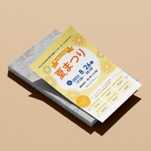 子供向け夏祭りチラシ 前提条件 デザインの説明 いつ・どこで開催かすぐにわかるよう、文字の優先順位をつけデザインしました。イベント内容は、屋台のようなデザインにし、子供たちが参加してみたくなるようデザインしました。明るく